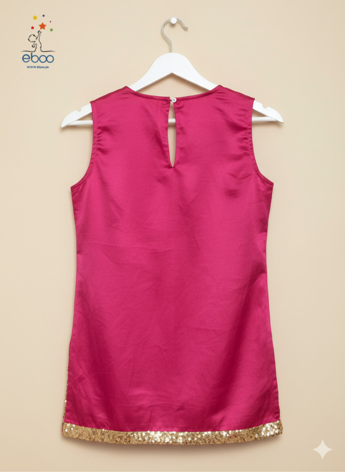 Top: Sleeveless fuchsia-pink satin blouse with a smooth, tailored finish