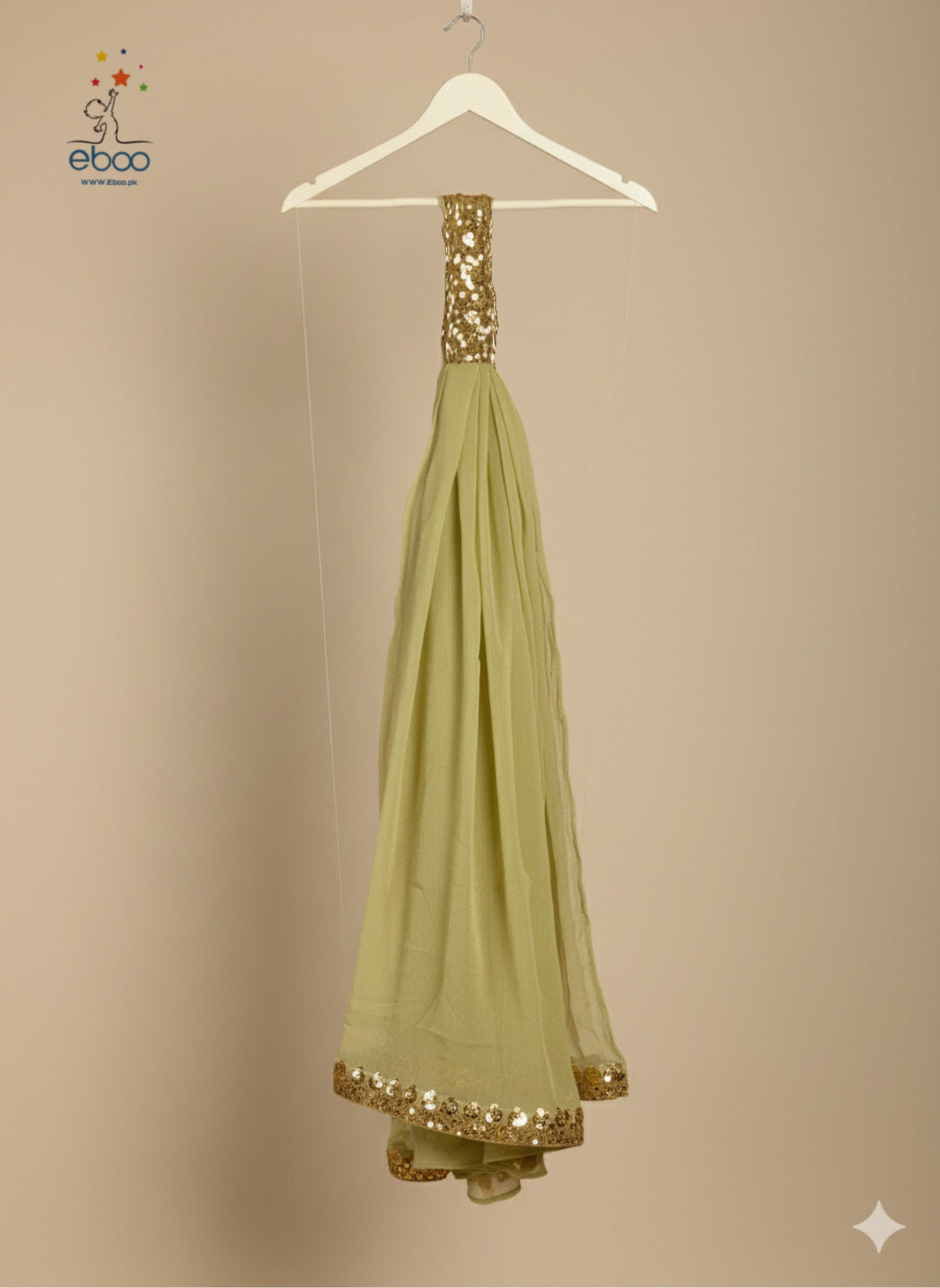 Dupatta: Olive green chiffon dupatta with sequin detailing and a delicate ruffle border