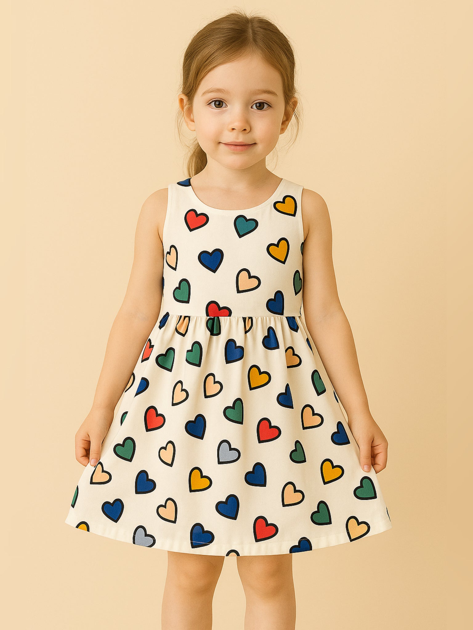 This adorable sleeveless dress is perfect for your little girl. It features a cute and colorful heart pattern on a white background.