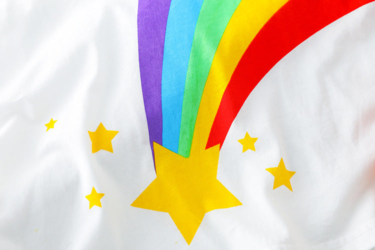 This adorable set includes a pair of rainbow overalls and a short-sleeved shirt.